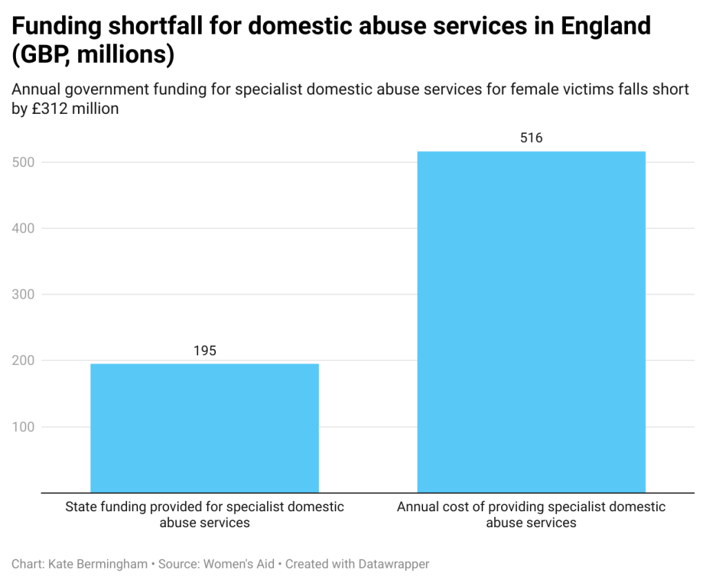 Indeed, earlier this year, Women’s Aid reported a funding shortfall of £321 million for specialist domestic abuse services in England. Women’s Aid have calculated a total annual service cost of £516 million. So, specialist domestic abuse services are currently receiving less than half the funding they need in order to deliver a safe and adequate service to women who are trying to escape and recover from domestic abuse.