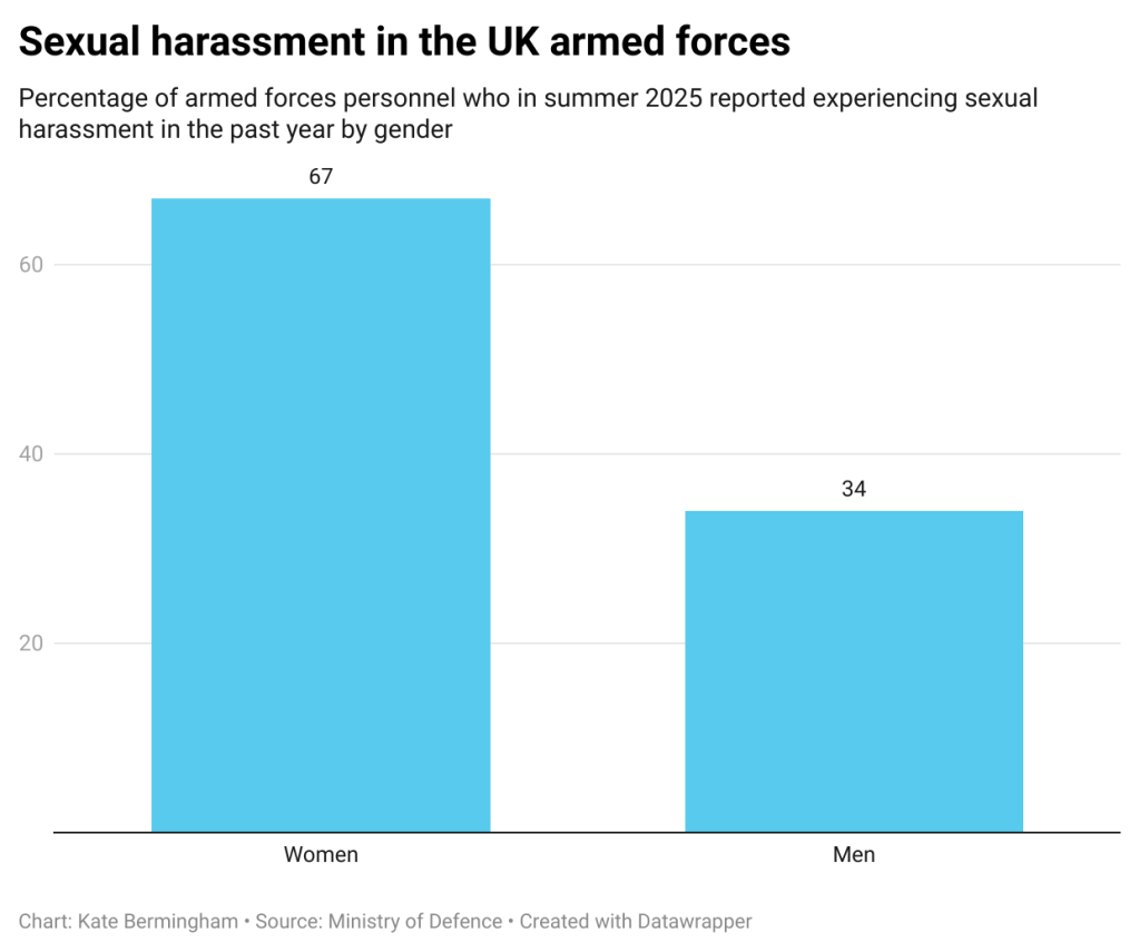 The MoD survey finds two-thirds of women in the armed forces reported at least one form of sexual harassment or sexualised behaviour, while one third of men reported the same. Nearly 1 in 10 women in the British military reported they had been subjected to sexual assault or other non-consensual sexual activity in the past year, and a third said they had been groped or touched in a way that made them feel uncomfortable.